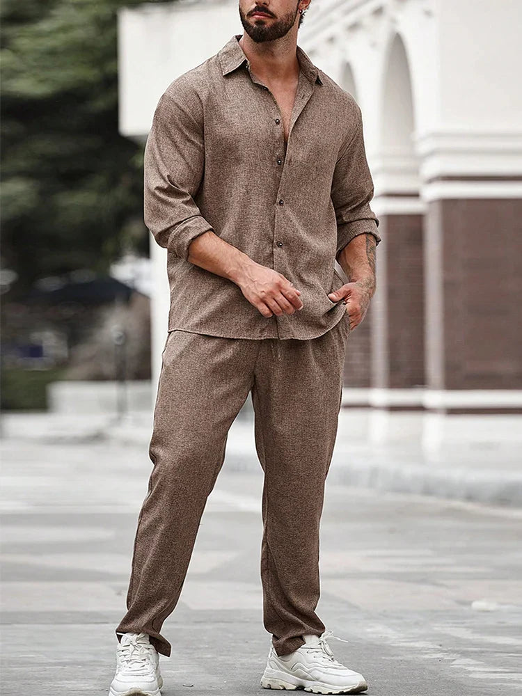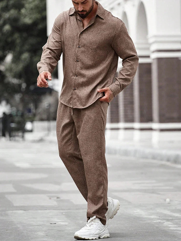 Fremstillet af en åndbar bomuld-linnedblanding, kombinerer dette todelte sæt til mænd vintage charme med hverdags sofistikering. Skjorten med turn-down krave passer problemfrit sammen med bukser med lige ben og tilbyder et strømlinet look til både afslappede og semi-formelle lejligheder.