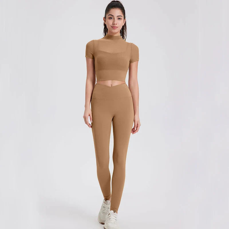 Dette todelte yogasæt inkluderer en kortærmet mesh-top og smørbløde leggings designet til fleksibilitet og åndbarhed. Designet til træning, løb og udendørs træning.