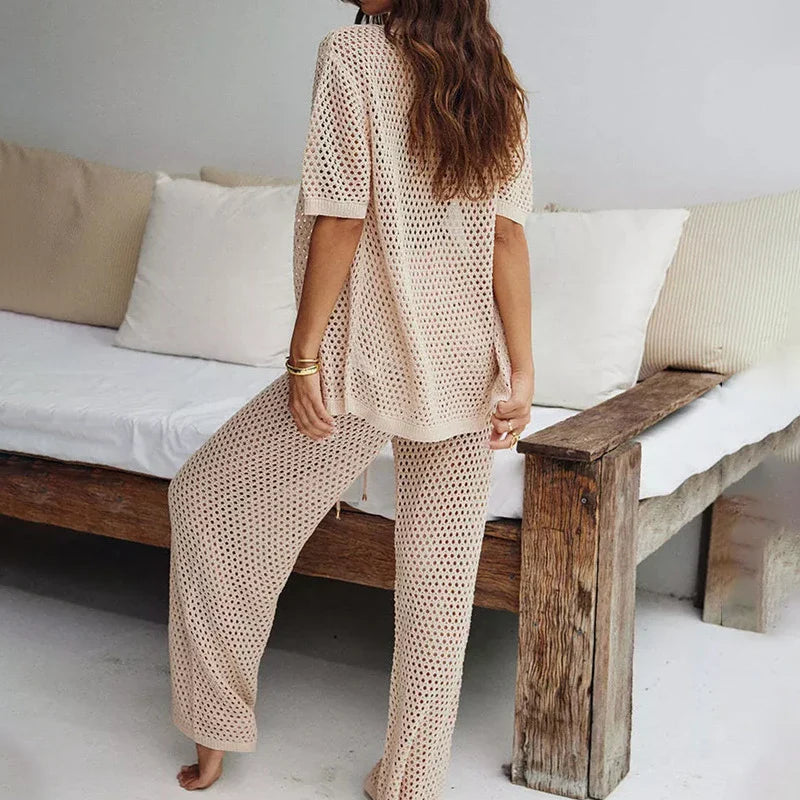 Dette sæt i to dele er lavet af luftigt hør og inkluderer en kortærmet skjorte med reverskrave og stilfulde udskæringer og lange, åndbare bukser. Stoffet skaber et cool og afslappet look, der nemt egner sig til både afslappede og klædelige lejligheder.