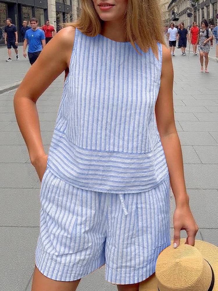 Dette korte 2-delte sæt til kvinder er det perfekte valg til varme sommerdage og afslappede udflugter. Sættet består af en let top og matchende shorts, der tilsammen skaber et harmonisk og moderigtigt look. Det er fremstillet i blødt, åndbart materiale, som sikrer komfort hele dagen.