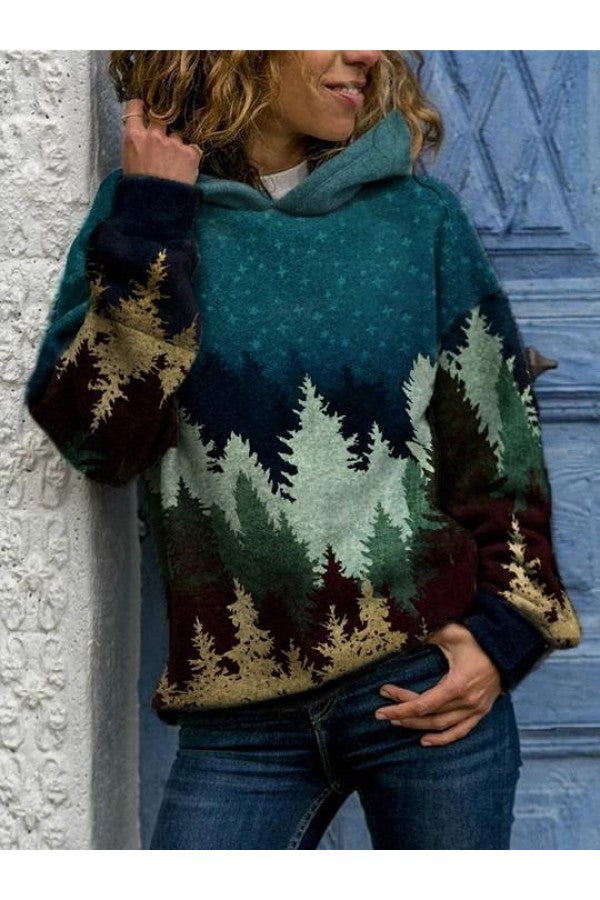 Grafisk Træprint Hættetrøje med Lange Ærmer til Kvinder