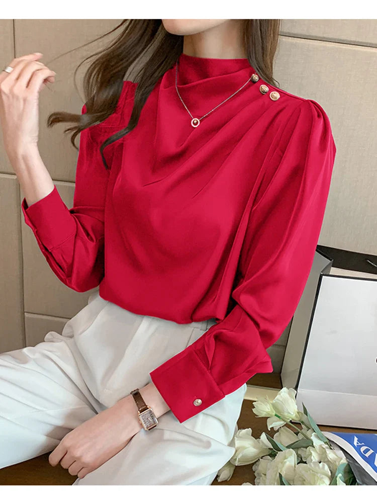 ✔ Højkvalitets satin- og chiffonstof: Bløde, flydende materialer, der giver blusen et luksuriøst look.