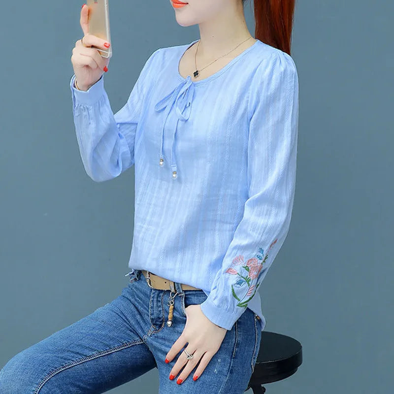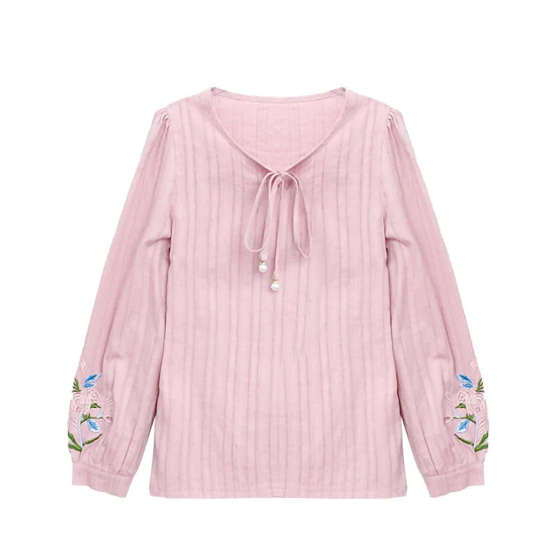 Bluse i Bomuldshør med Broderi og Sløjfe - Merrian