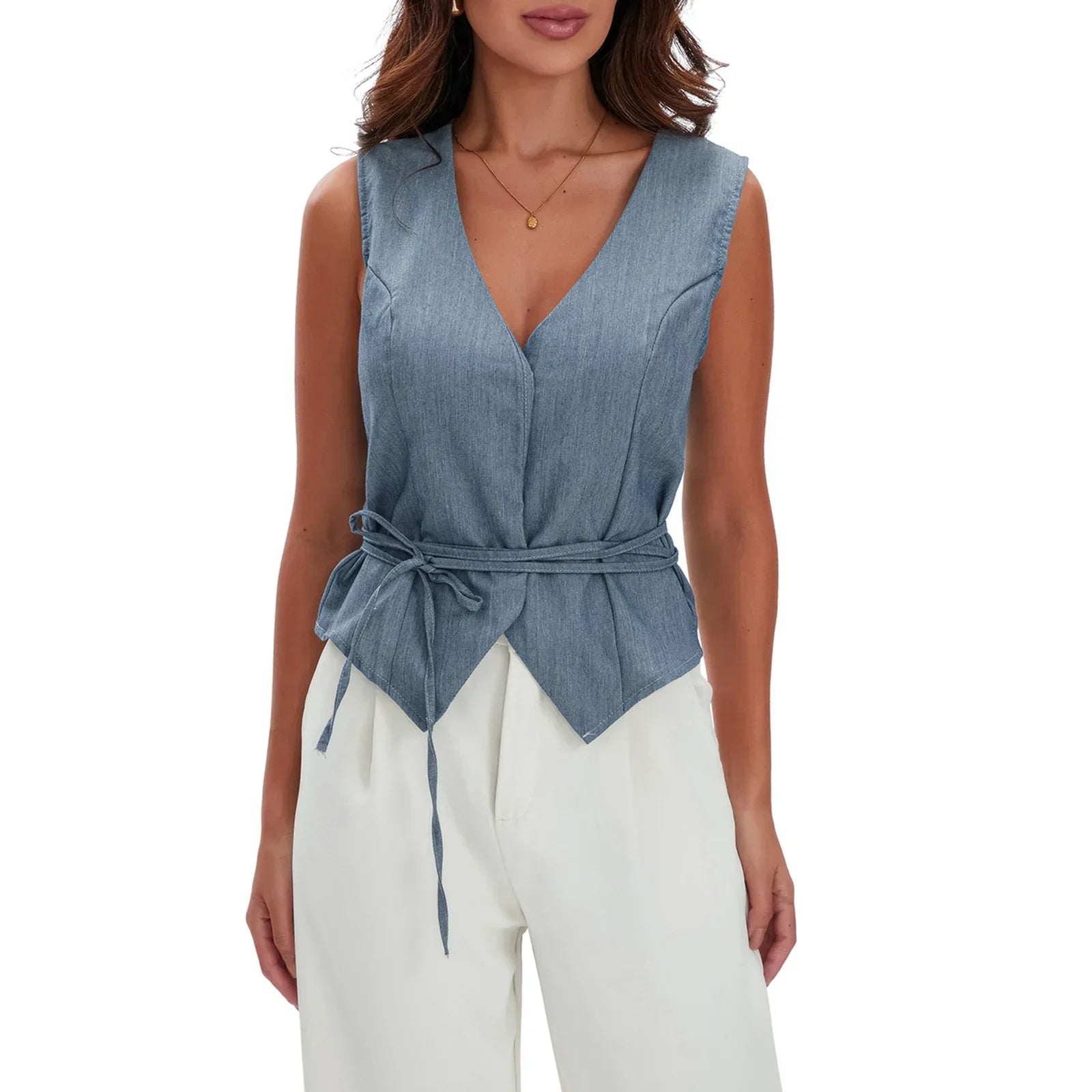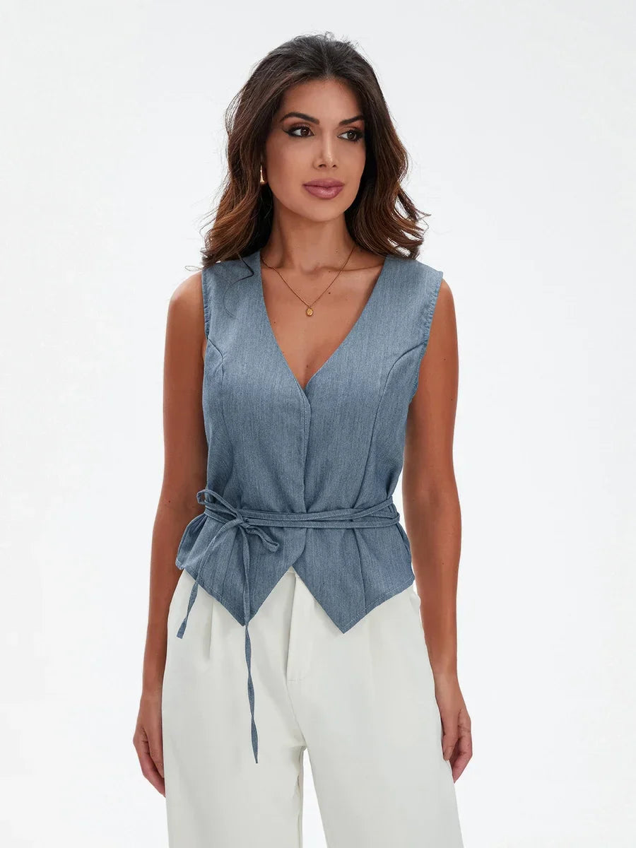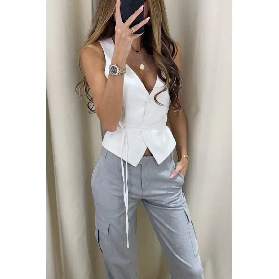 Denne ensfarvede vest til kvinder kombinerer et elegant ærmeløst design med en flatterende V-udskæring og bindedetaljer i taljen. Den slanke pasform tilføjer et skræddersyet touch, mens knapper fremhæver det elegante look.