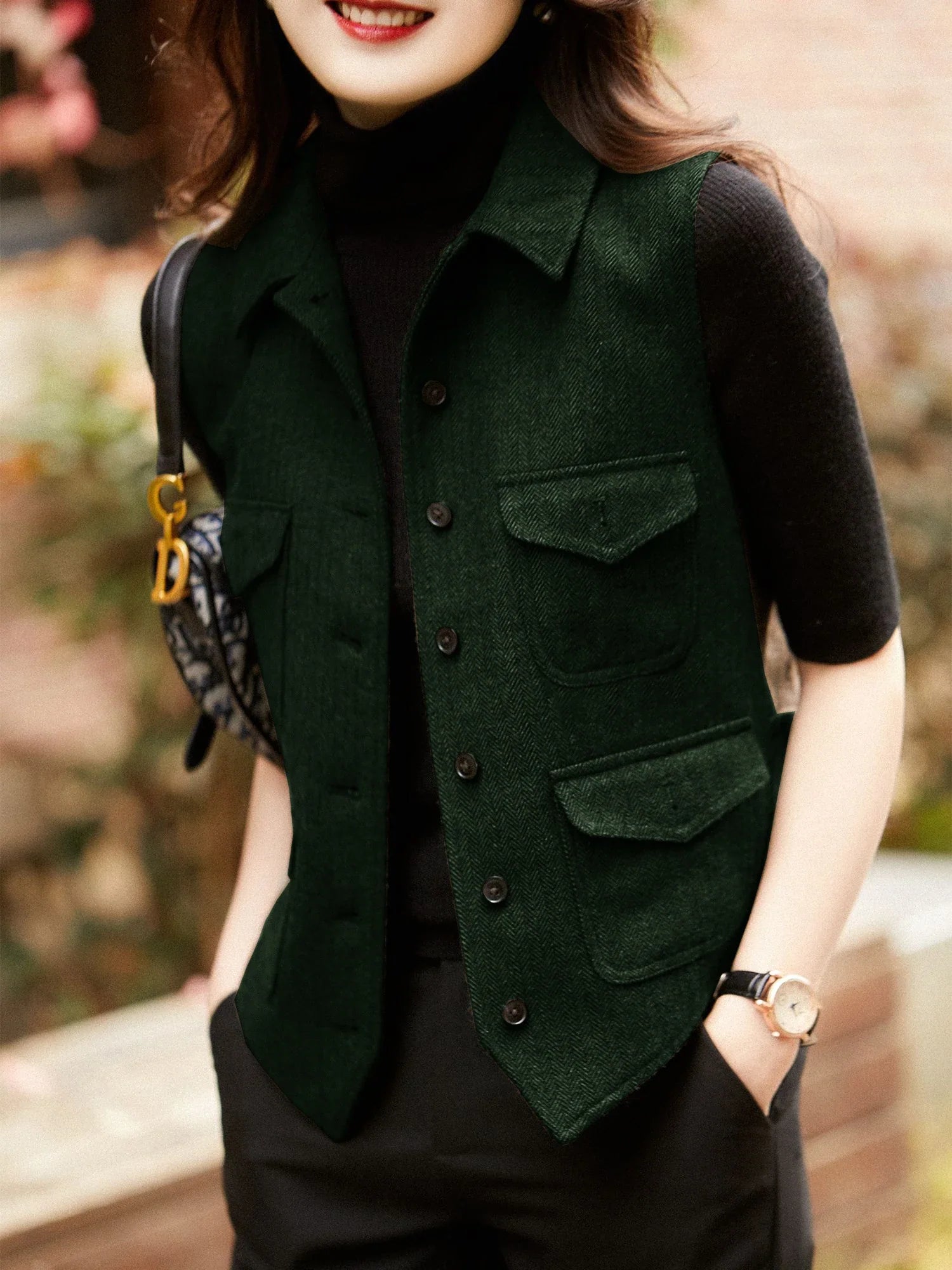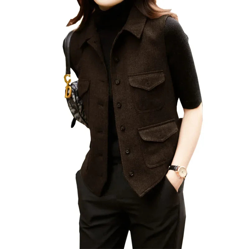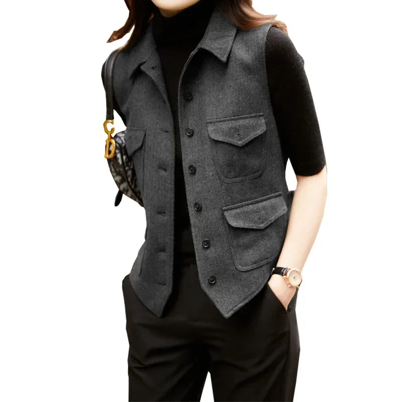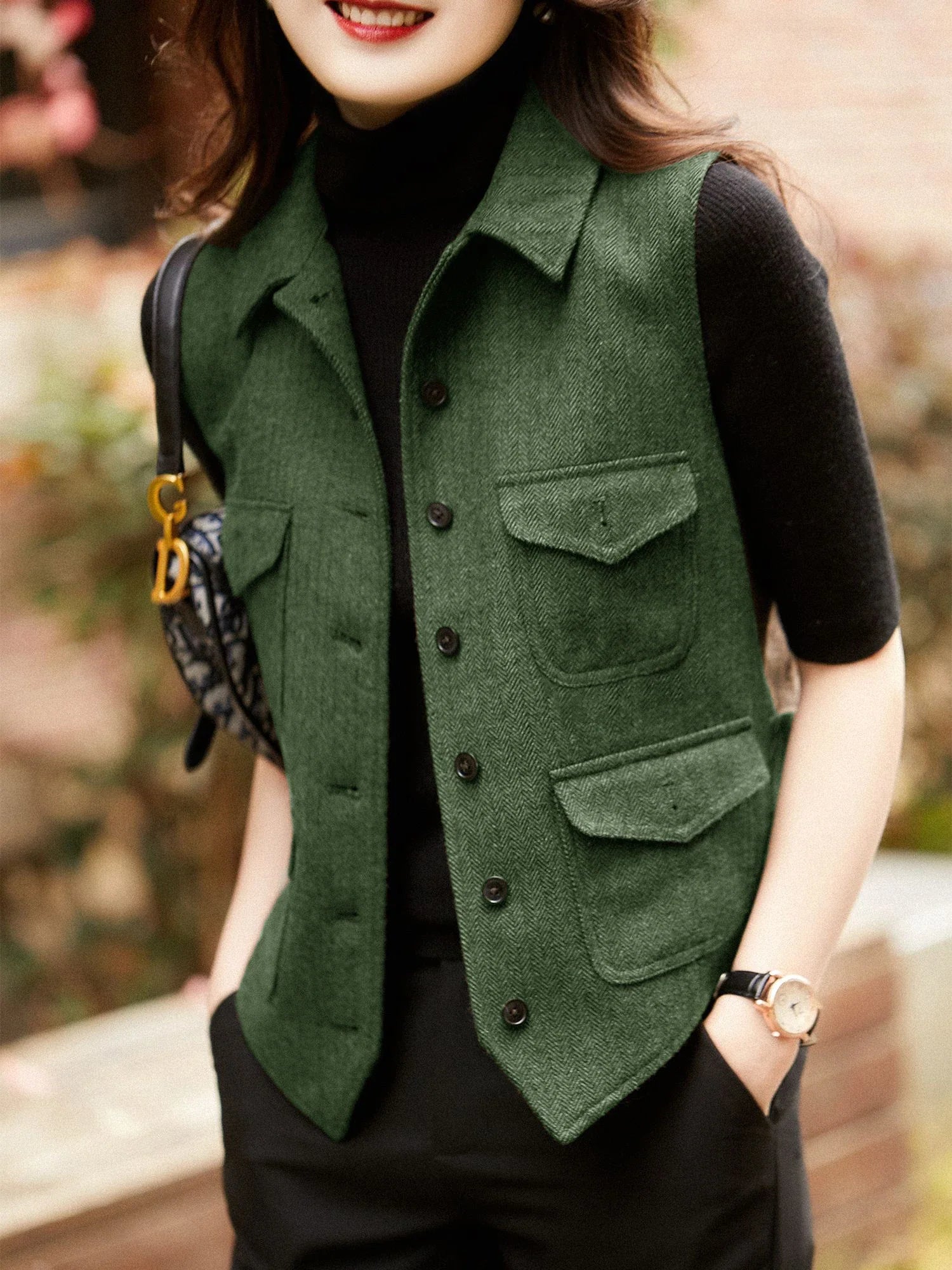 Denne sildebensvest til kvinder vil tilføje et strejf af elegance til forårets outfits. Vestens slanke design understreger en sofistikeret silhuet, hvilket gør den til et alsidigt valg til forretnings- og afslappede lejligheder.