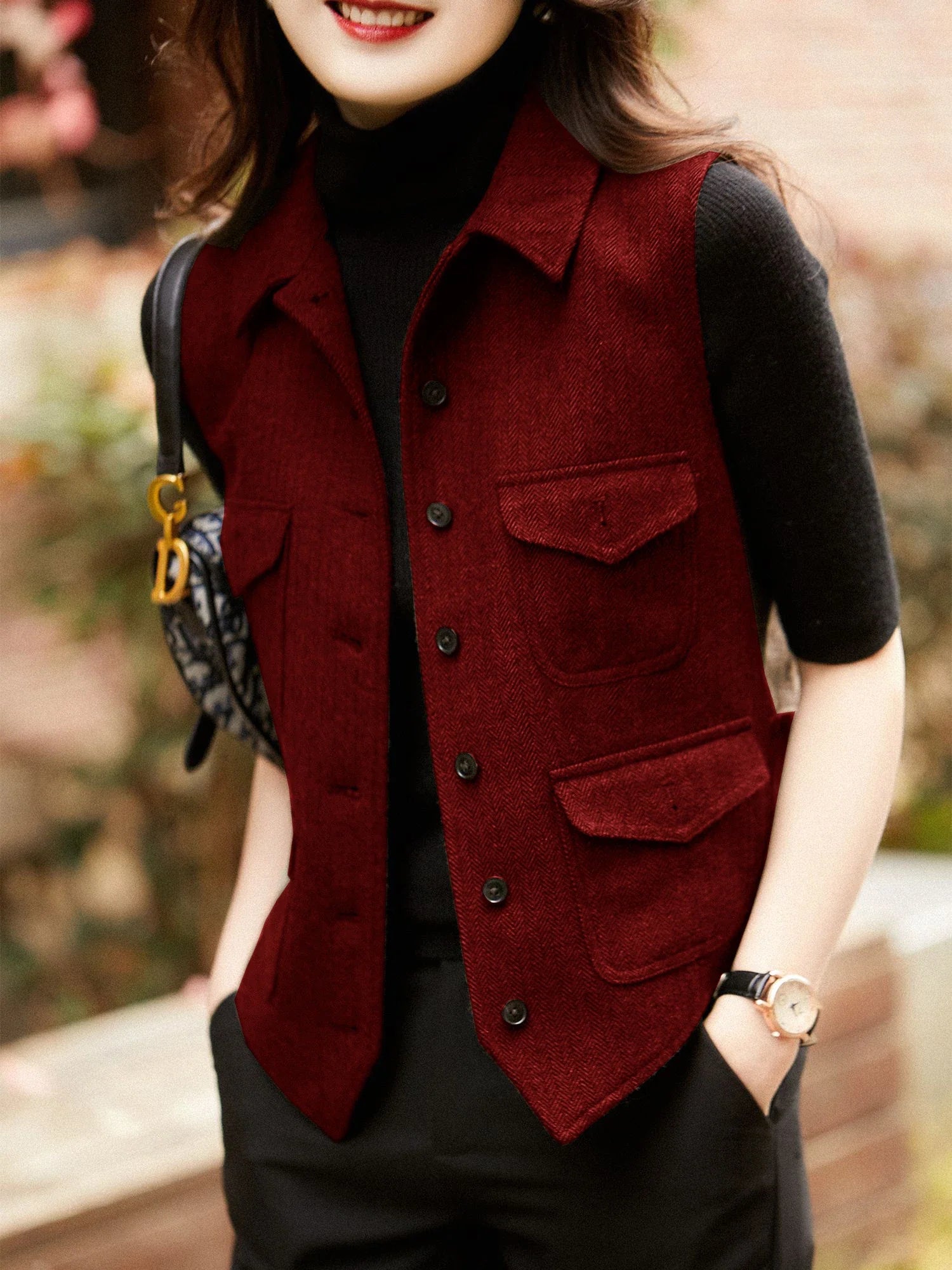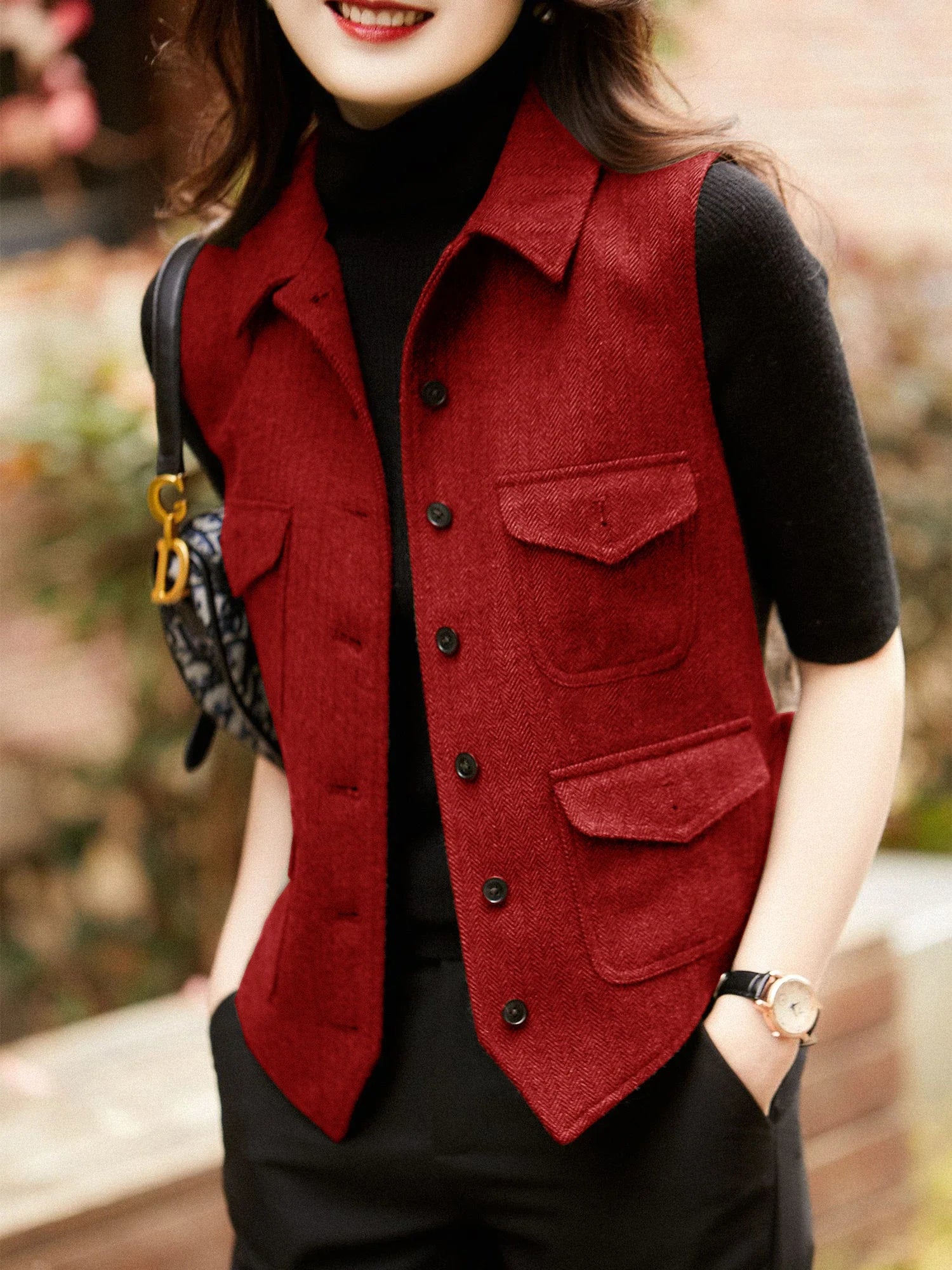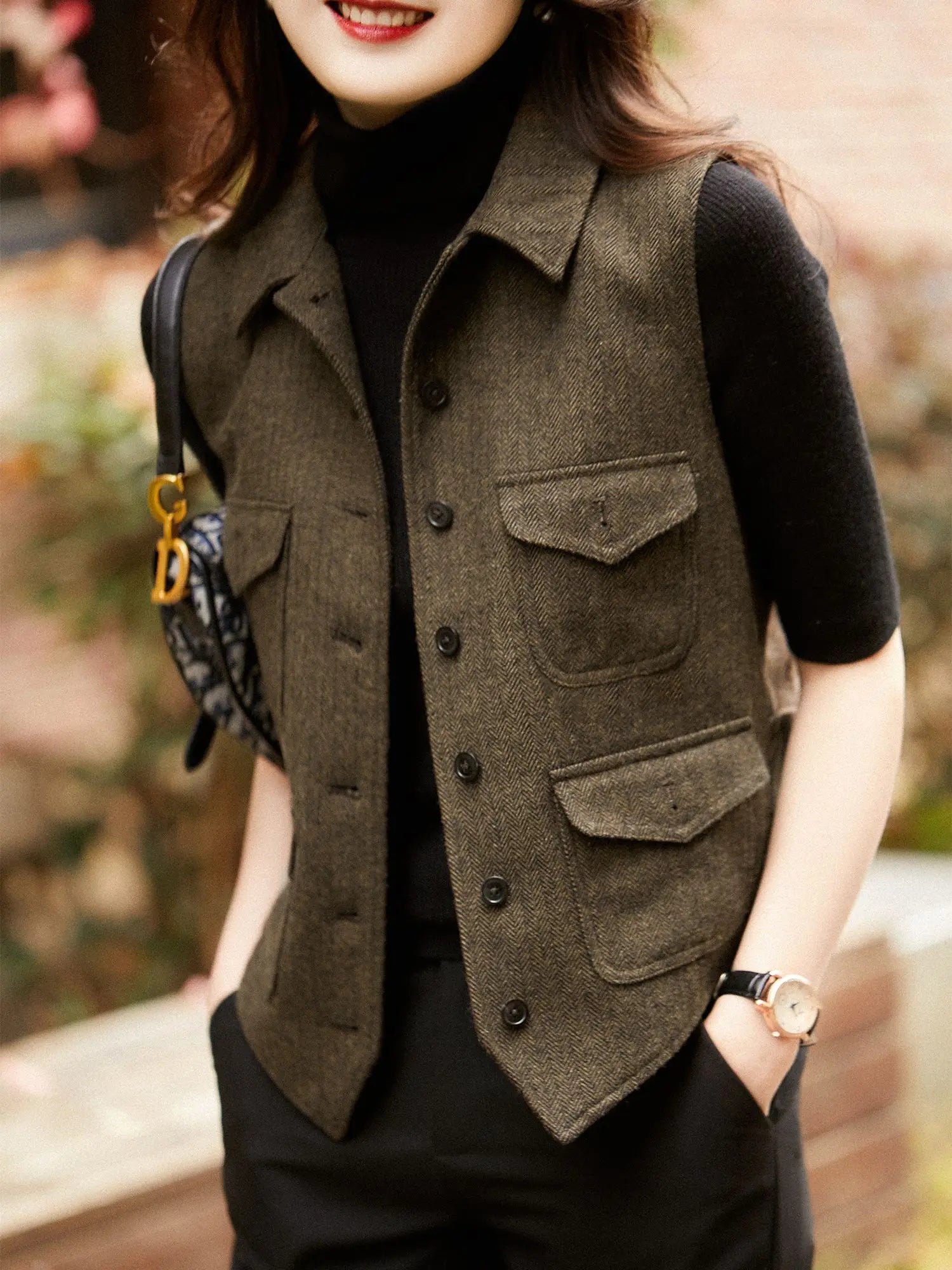 Med sin ærmeløse stil og klassiske sildebensmønster vil denne vest tilføje sofistikering til ethvert ensemble. Den passer problemfrit sammen med skjorter, bluser eller skræddersyede bukser for et ubesværet elegant look.