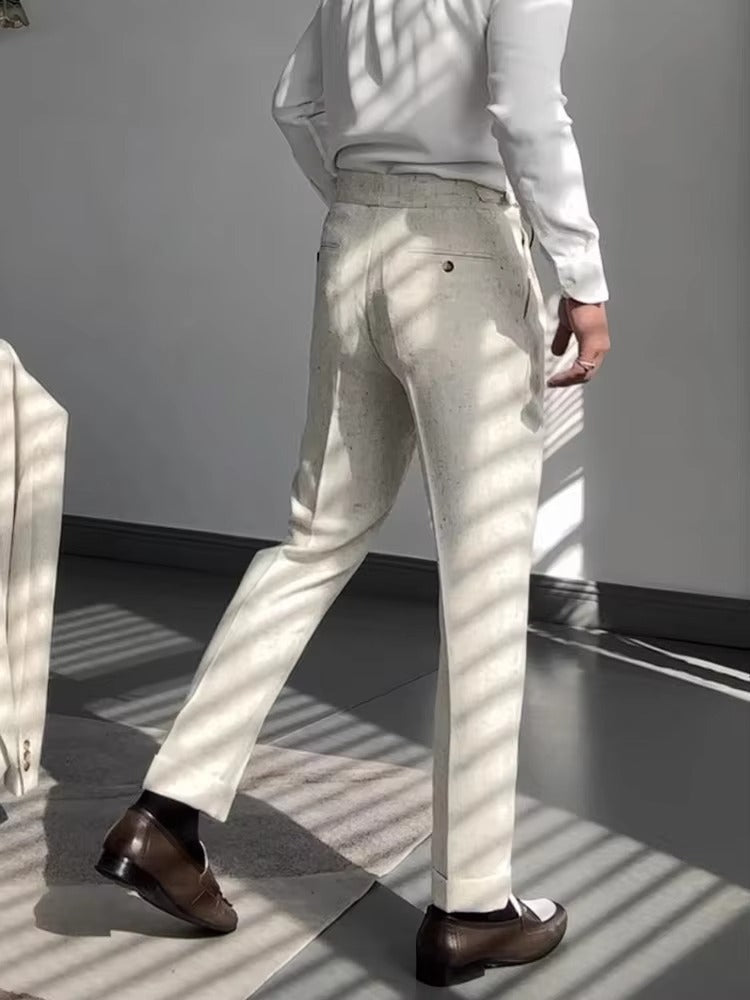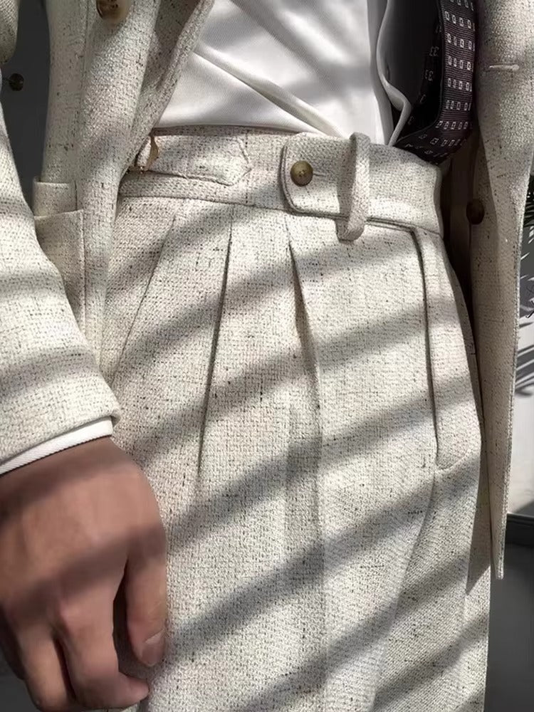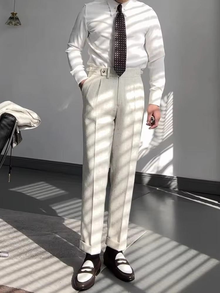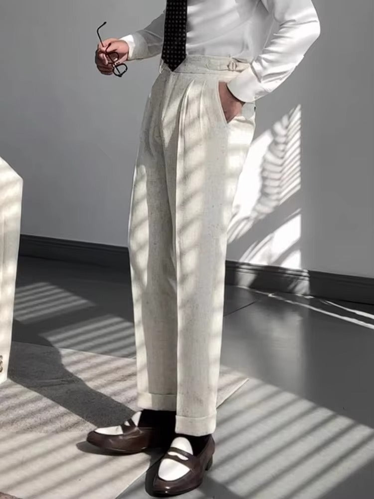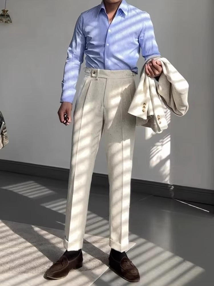 Disse højtaljede plisserede bukser til mænd lavet af et højkvalitets uldblandingsstof er et tidløst stykke tøj til foråret og overgangsperioden.