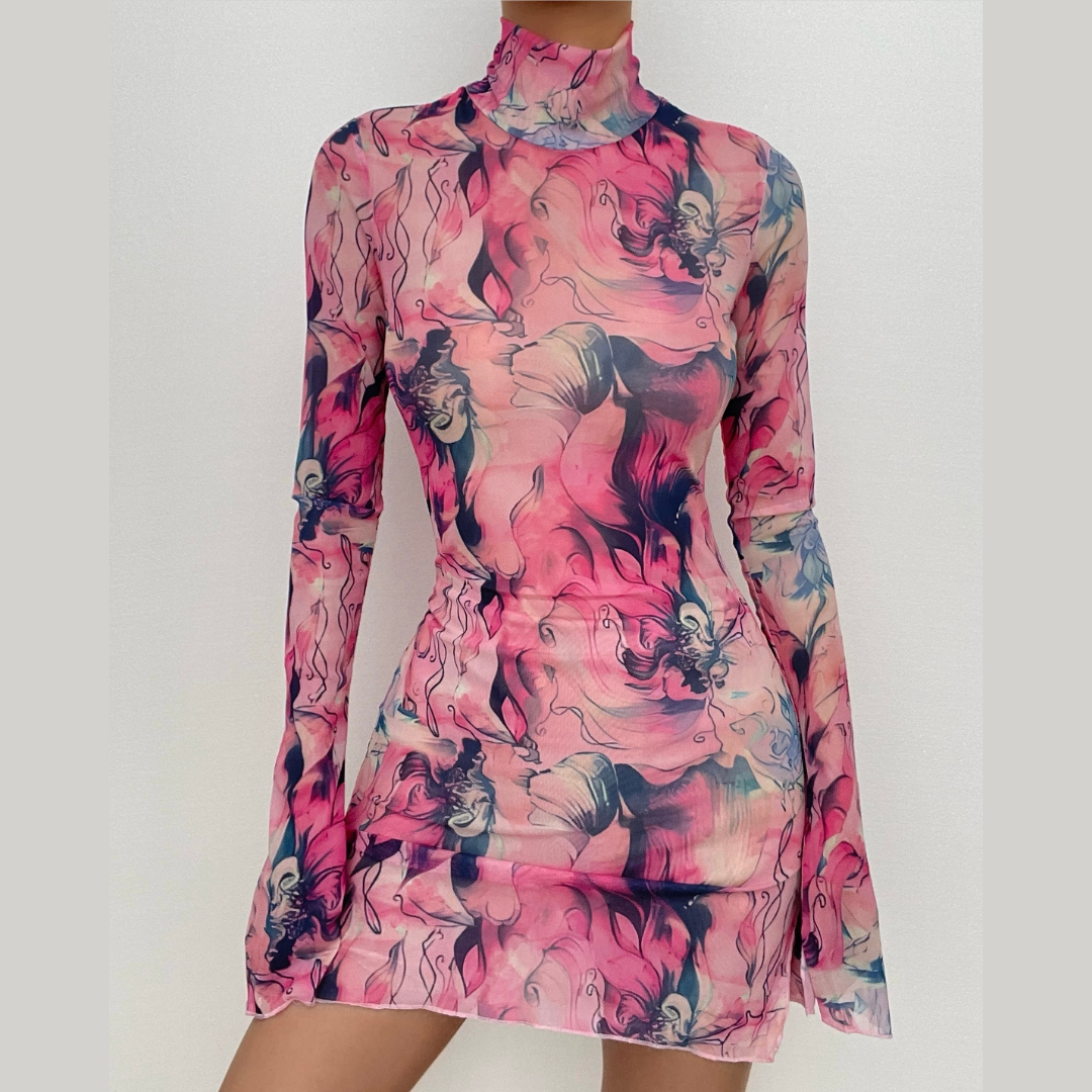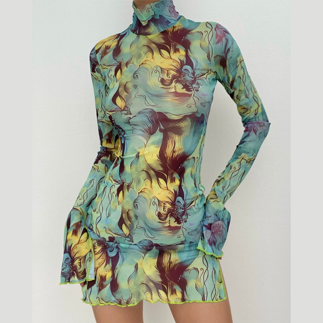 Oplev en kombination af elegance og moderne stil med denne smukke mesh-kjole til kvinder. Kjolen er designet med en sofistikeret rullekrave og en flatterende slids, der tilføjer et strejf af dramatik til dit outfit.