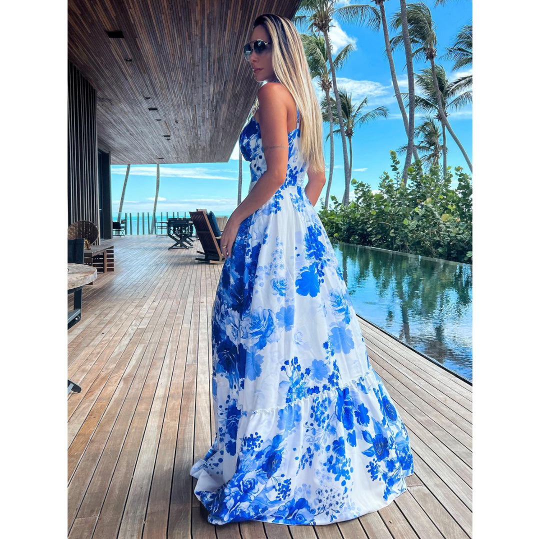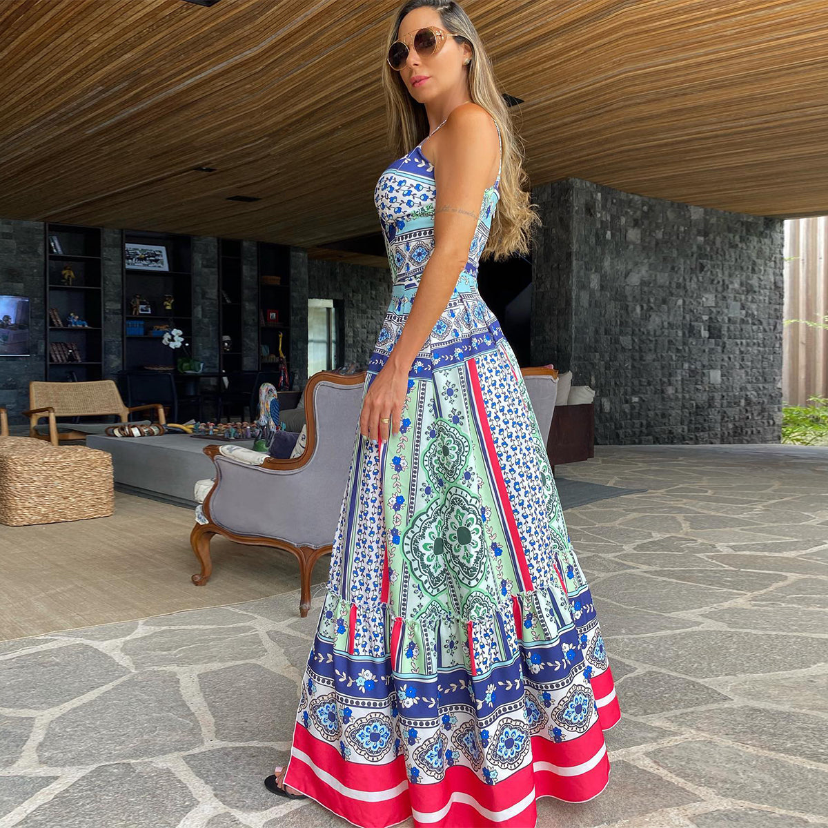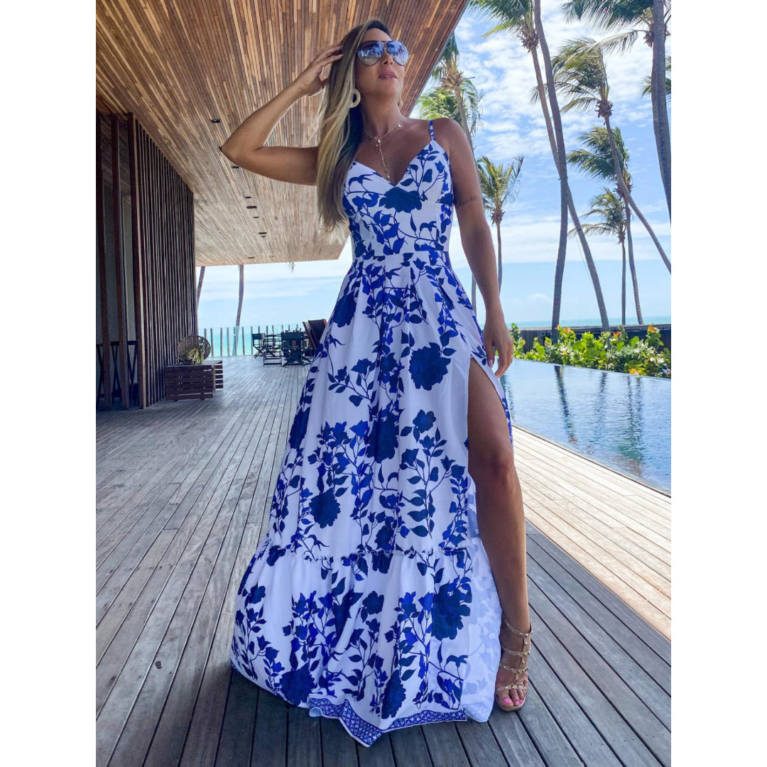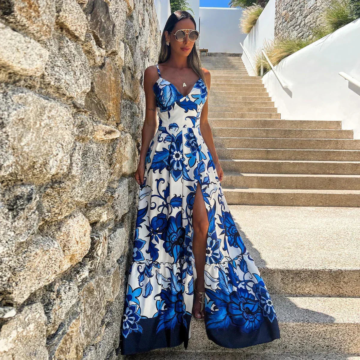 Lang ærmeløs kjole i livlige farver med høj slids - Sommerlook - Jervania