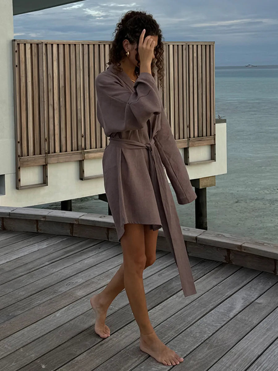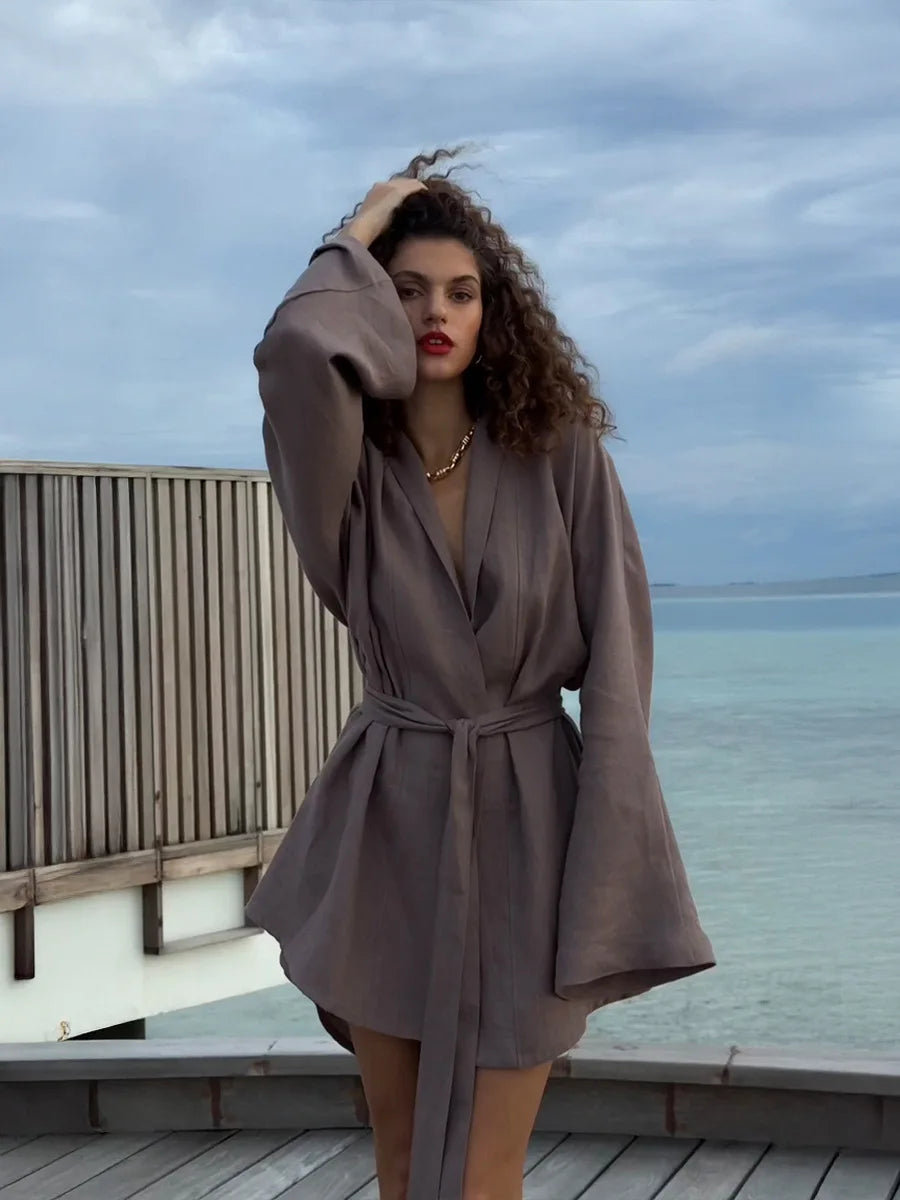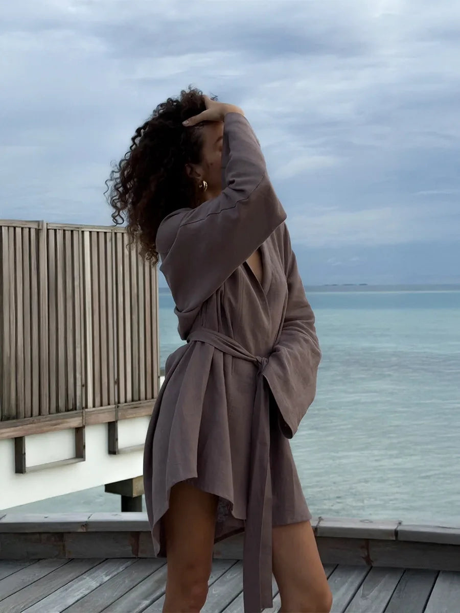 Pak dig ind i Shannina-kåbekjolens tidløse charme. Denne langærmede kjole er lavet af en åndbar bomulds-hør-blanding og har delikate blondeaccenter og en afslappet silhuet i kappen.