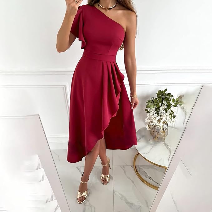 Oplev ren elegance med vores asymmetriske maxikjole, forstærket af et enkelt flæseærme, subtil talje og høj slids for en forførende silhuet.